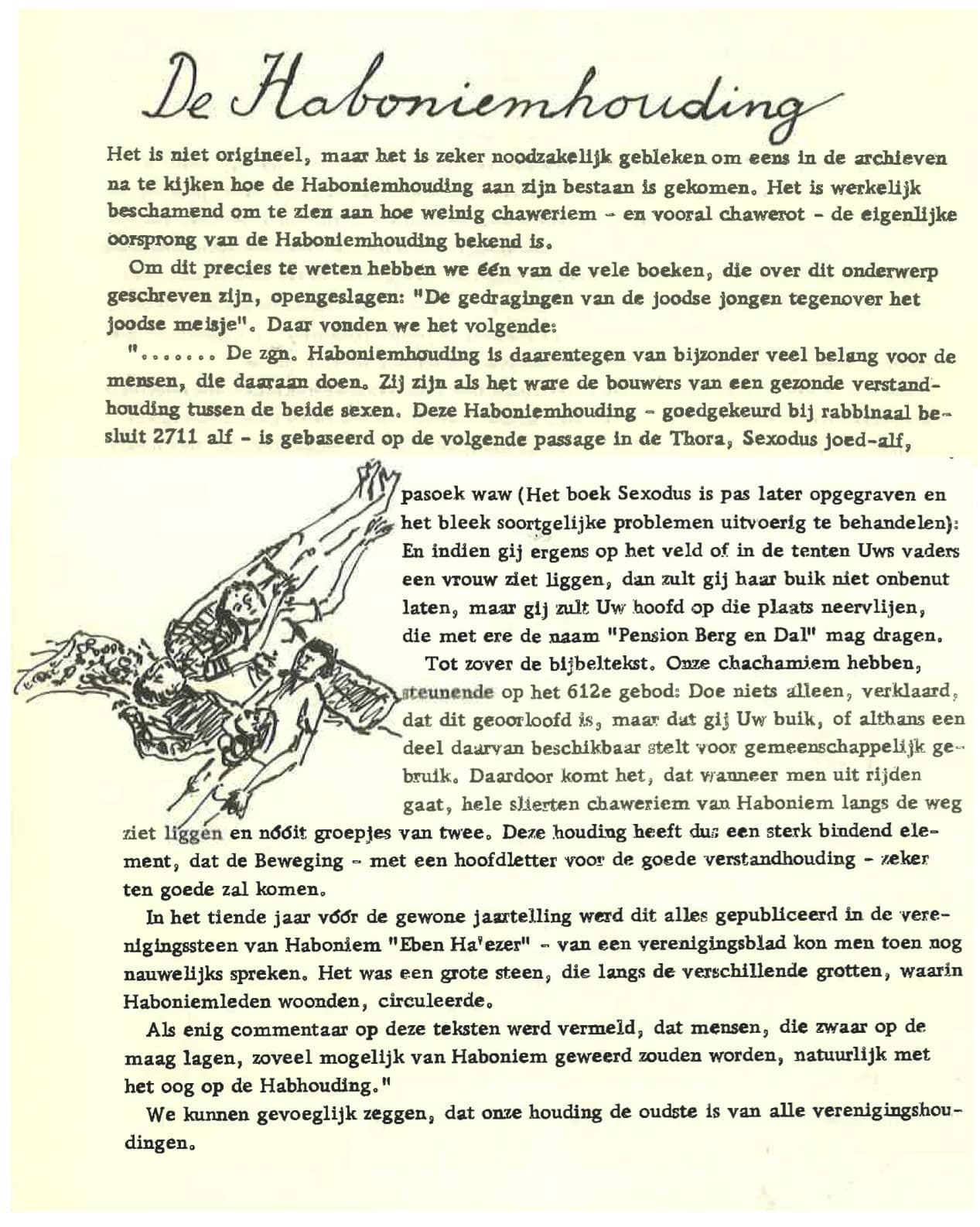‘De zogenaamde Haboniem-houding was een heel belangrijk iets. Dat ging als volgt: een persoon ging liggen, de volgende persoon ging horizontaal met het hoofd op de buik van de eerste liggen. Vervolgens ging er een derde met zijn hoofd op de buik van de tweede liggen, en daarna een volgende, en daarna weer een ander. Het werd een soort diagonaal geval. Dat was de Haboniem-houding. Ik neem aan dat die tot op de dag van vandaag nog gedaan wordt, maar ik weet het niet zeker. Die houding was heel beroemd en bekend. Werden het te veel jongelui, dan ging een meisje of jongen apart liggen en begonnen ze opnieuw. Het gebeurde niet georganiseerd, het gebeurde volgens mij spontaan. Ik vond het ook iets heel leuks hebben. Het had niets seksueels. Het wilde uitdrukken: wij zijn vrienden onder elkaar, met geen enkele bijbedoeling. Toen in ieder geval niet, en in ieder geval niet bij mij. Later zal het wel anders geworden zijn, maar dat was niet in mijn tijd. Het is een dierbare gedachte eigenlijk.’