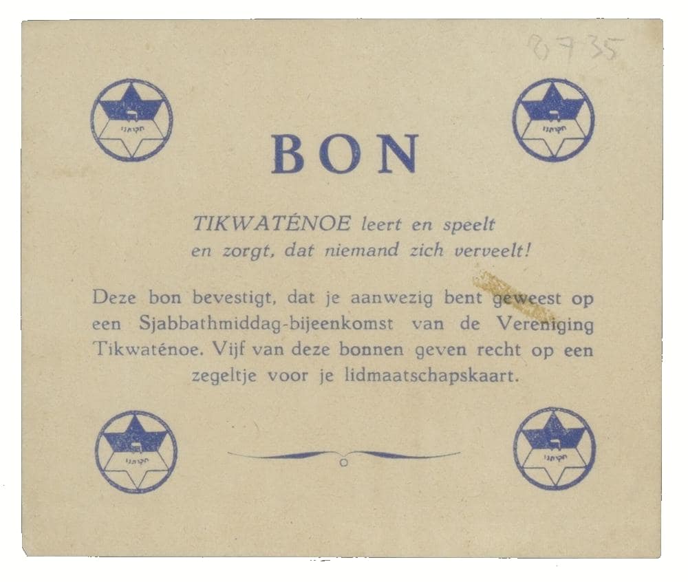 We hebben kinderen op allerlei manieren bereikt, bijvoorbeeld via advertenties in het NIW. Tikwatenoe had lidmaatschapskaarten, maar we hadden ook een embleem. Het was een lapje stof. Ik heb het nog. Het is nu gebroken wit. Het kan zijn dat het vroeger helderwit was, maar dat het in de loop der jaren vuil is geworden. Het is 7,5 bij 9 centimeter lang. Het heeft een donkerblauwe rand die helemaal is omgewerkt. Er staat een lichtblauwe Magen David (davidster) op geborduurd. Aan de bovenkant is de Magen David opgevuld met lichtblauw, de onderkant is wit gelaten en daaronder staat een notenbalk. Het was mijn ontwerp. In de Magen David staat “chai” geschreven. In de notenbalk daaronder staan geen noten, maar is “Tikwatenoe” in het Hebreeuws geborduurd. Er staat wel een notensleutel voor. Ik weet niet meer of alleen de leiders dat ophadden of ook alle kinderen of dat het alleen voor het muziekgroepje was.’