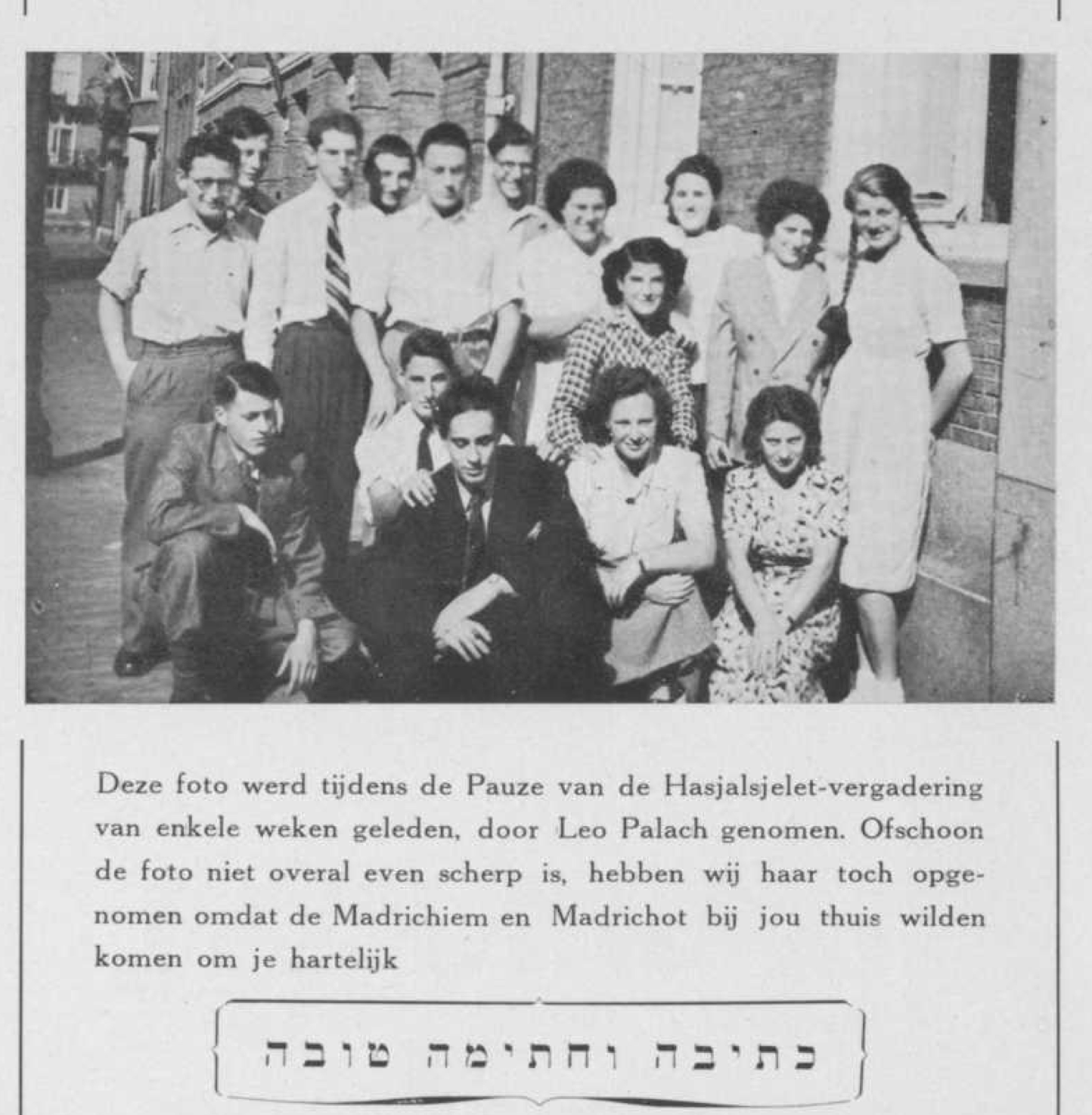 ‘Er waren niet zo veel kinderen bij Hasjalsjelet in Haarlem, een stuk of tien, of zo. Ik was al heel snel madriech. De bijeenkomsten waren op Sjabbat. Ik bereidde de afdeling van de week voor. En we zongen ook. Ik denk dat we daarna ook spellen deden. Ik denk dat de bijeenkomst in de sjoel was of anders in het “gemeentegebouw”, zo heette dat. Het was los van de synagoge. Het was ook op een andere plaats, maar het hoorde bij de Joodse gemeente. Hoelang zo’n bijeenkomst duurde weet ik niet meer. Ik kan me de rivaliteit tussen Bne Akiwa en Hasjasjelet goed herinneren.’