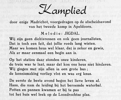 ‘Ik kan me nog herinneren dat er regelmatig zomer- en winterkampen op de Veluwe waren. Dan moesten er heel wat voorbereidingen getroffen worden, want er werd in de zomer- en winterkampen koosjer gekookt. Hasjalsjelet had een eigen keukenuitrusting en die moest dan altijd naar het kamp toe gereden worden.