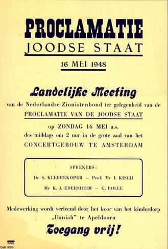 ‘Er waren in 1948 vijfhonderd kinderen in Apeldoorn gehuisvest in de gebouwen van de voormalige inrichting Het Apeldoornsche Bosch. Die waren bij elkaar geveegd in Europa. Ze waren verbonden aan politieke bewegingen, dat wil zeggen de leiders, organisaties als Agoedat Jisraël en Hasjomeer Hatsaïr. En die kinderen zijn op 16 mei 1948 vanuit Apeldoorn naar Amsterdam gekomen. Ze gingen naar het Concertgebouw om te zingen. Daar was een heel grote bijeenkomst. Na de bijeenkomst heeft de Joodse jeugd van Amsterdam deze groep uit Apeldoorn teruggebracht naar het Centraal Station. Iedereen liep met Israëlische vlaggen te zwaaien. Dat was een heel grote optocht.