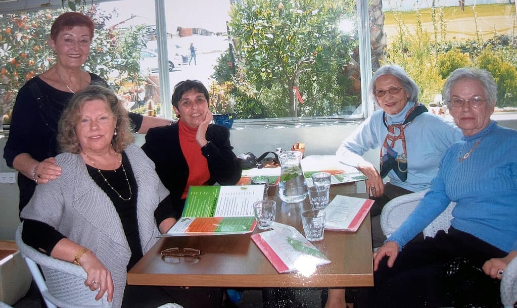 Marianne met haar collega’s/vriendinnen van de Hebreeuwse Universiteit tijdens een verjaardag. Van links naar rechts: Ilana Slyper. Toma Kozov, Liba, Lina Fischer en Marianne