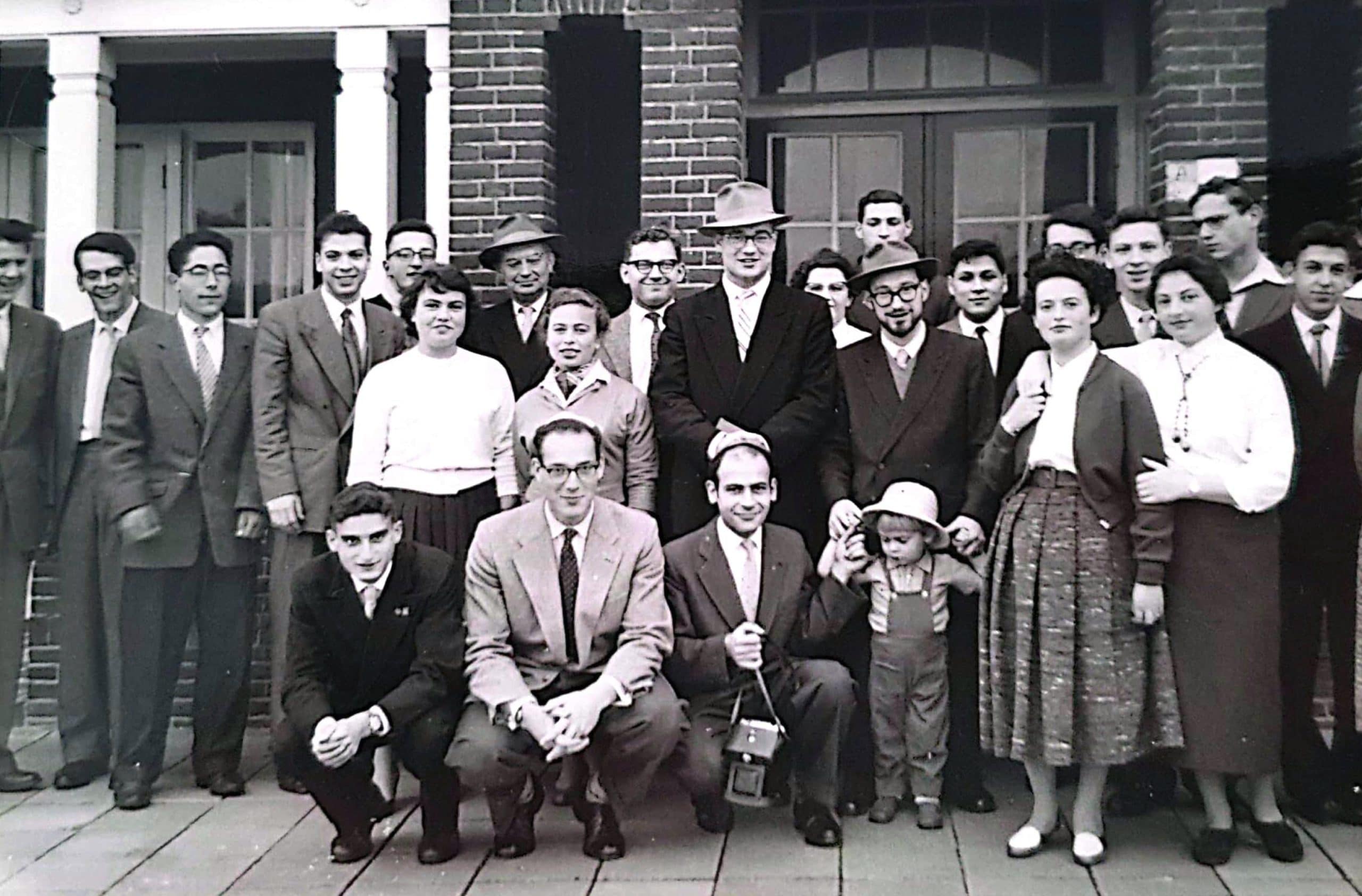Marthi: ‘Deze foto is genomen op een zondagochtend in november 1957 in, naar ik meen, Jozeboko, Wijk aan Zee. Daar was een weekend georganiseerd voor jongeren die te oud waren voor Bne Akiwa en waarvoor er geen datie organisatie meer was. Er was alleen de NZSO en daar waren datie en niet-datie studenten lid van. De meisjes die leerden op de School voor Maatschappelijk Werk, mochten daar aanvankelijk geen lid van zijn, maar later werden de regels versoepeld. De oudere meneer met hoed op de achterste rij is meester Konig die sjioeriem heeft gegeven.’ Marthi staat direct voor meester Konig.